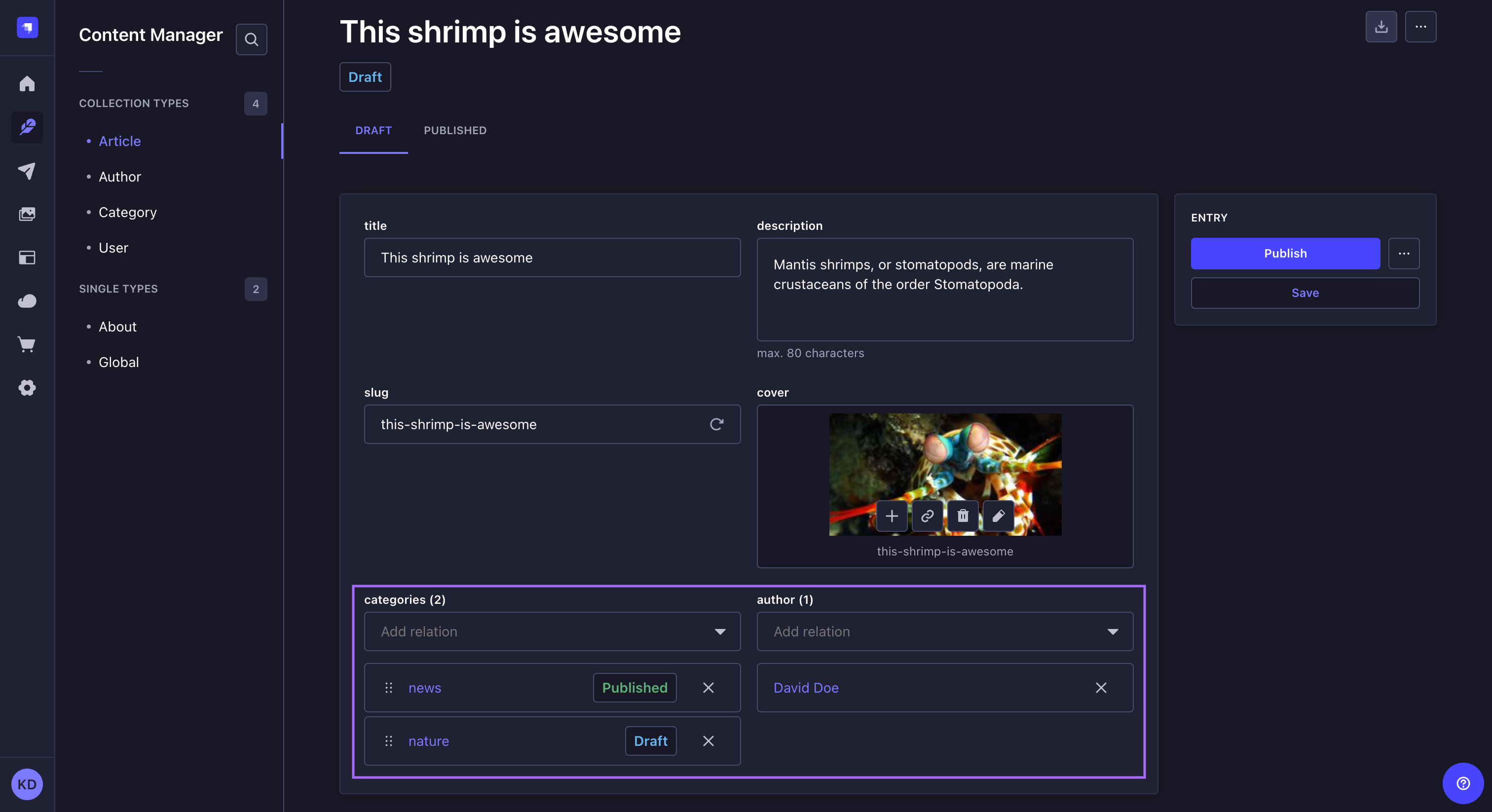 If the Draft & Publish feature (see Saving, publishing and deleting content) is activated for the content-type the relational field belongs to, you will notice blue or green dots next to the entries names in the drop-down list. They indicate the status of the entry, respectively draft or published content.